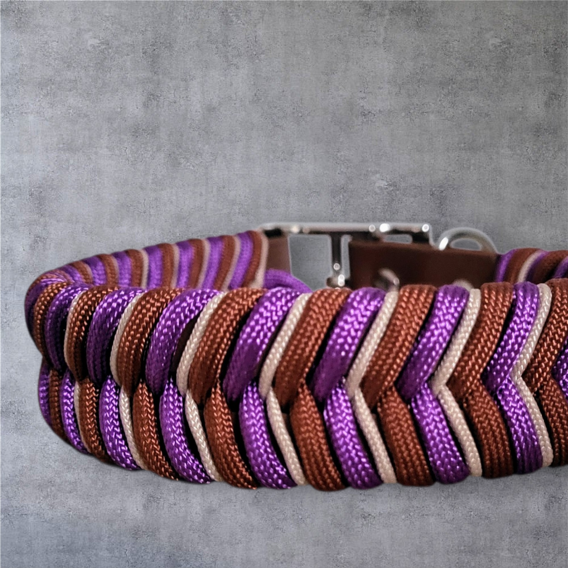 Material: Biothane Braun mit Paracord-Flechtung (Fishtail) in Braun, Purple und Sand