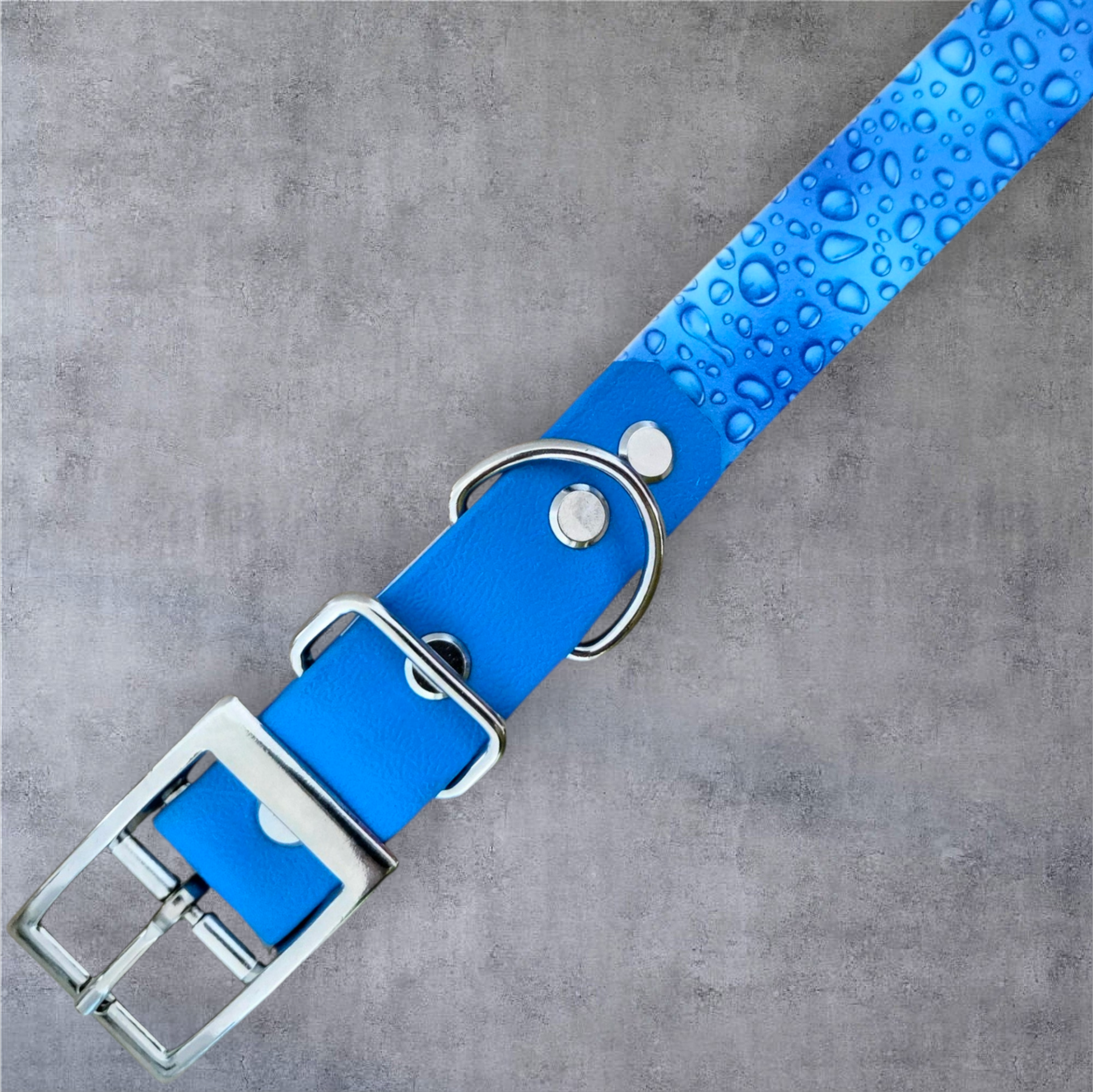 Material: Biothane Hellblau mit UV-Druck „Raindrops“
